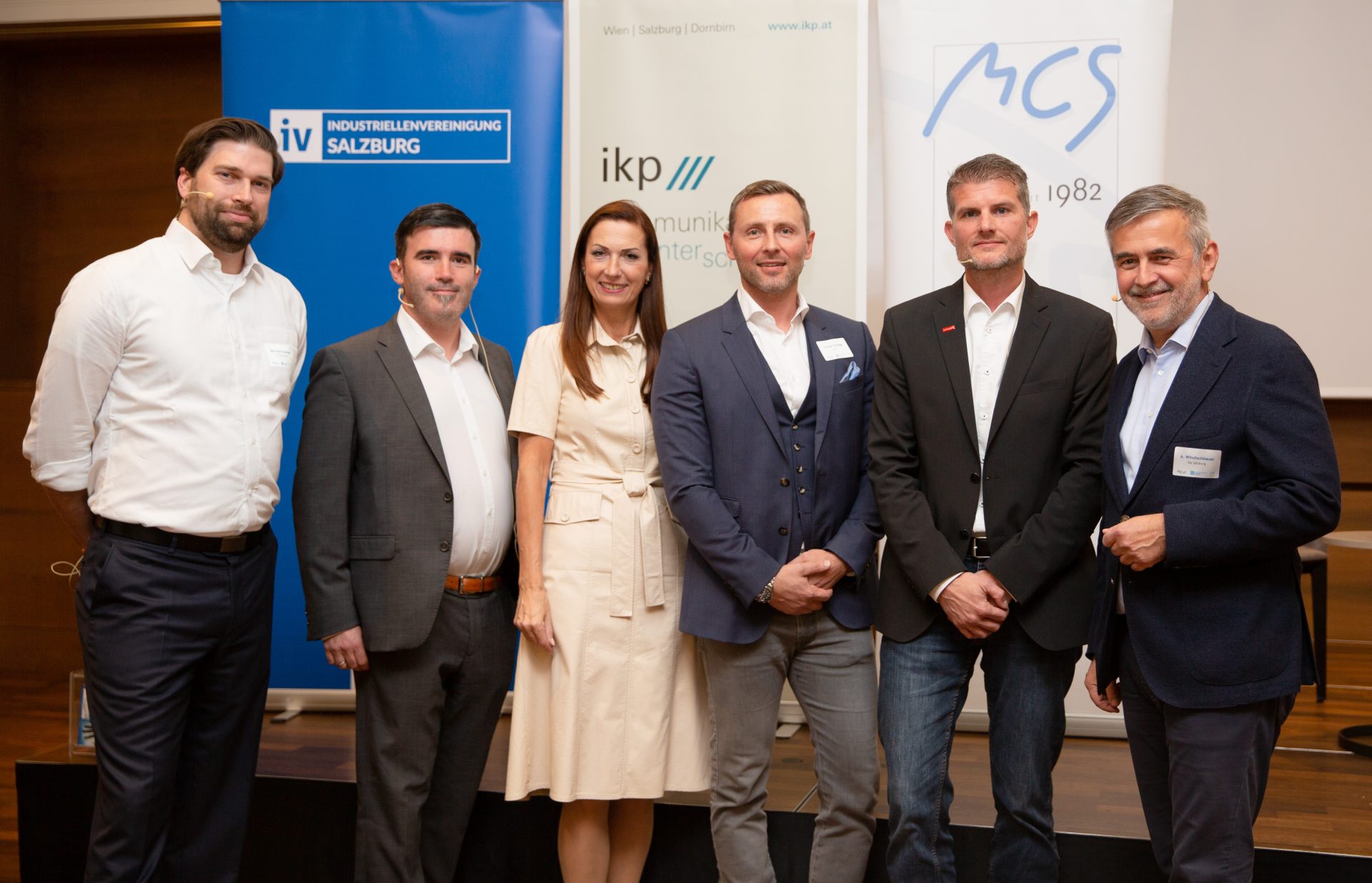 Expertentalk zu Cyberangriffen und Krisenkommunikation in Salzburg: (v.l.) Bernhard Zacherl und Gottfried Tonweber, Cybersecurity-Spezialisten bei EY Österreich, Irene Schulte, Geschäftsführerin der Industriellenvereinigung Salzburg, Florian Goldegg, Präsident Marketing Club Salzburg, Florian Schwap, Leiter Marketing SalzburgMilch und Andreas Windischbauer, Krisenspezialist der Kommunikationsagentur ikp Salzburg.